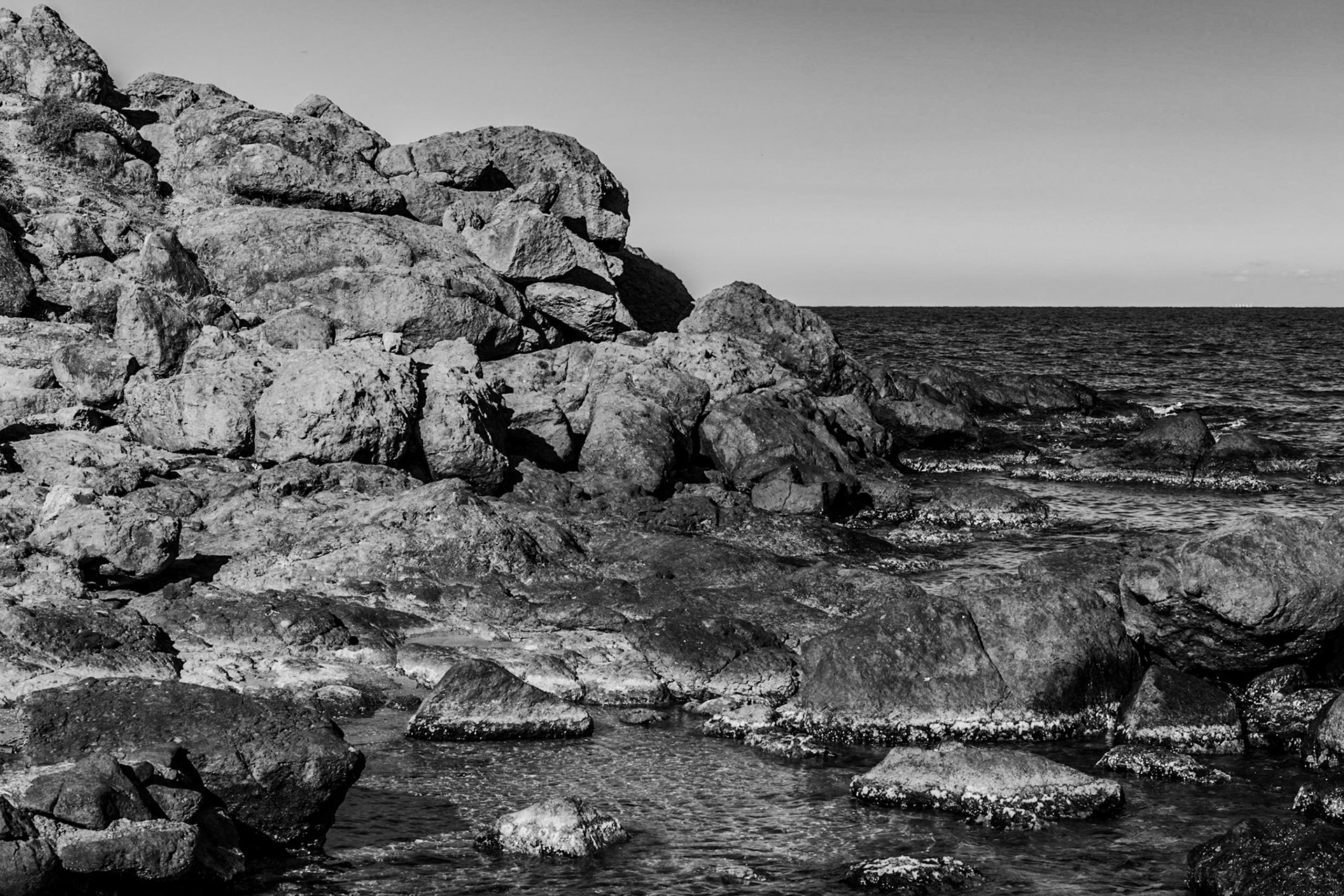 heading west along the line of the Black Sea: climbing over shore rocks with a dog